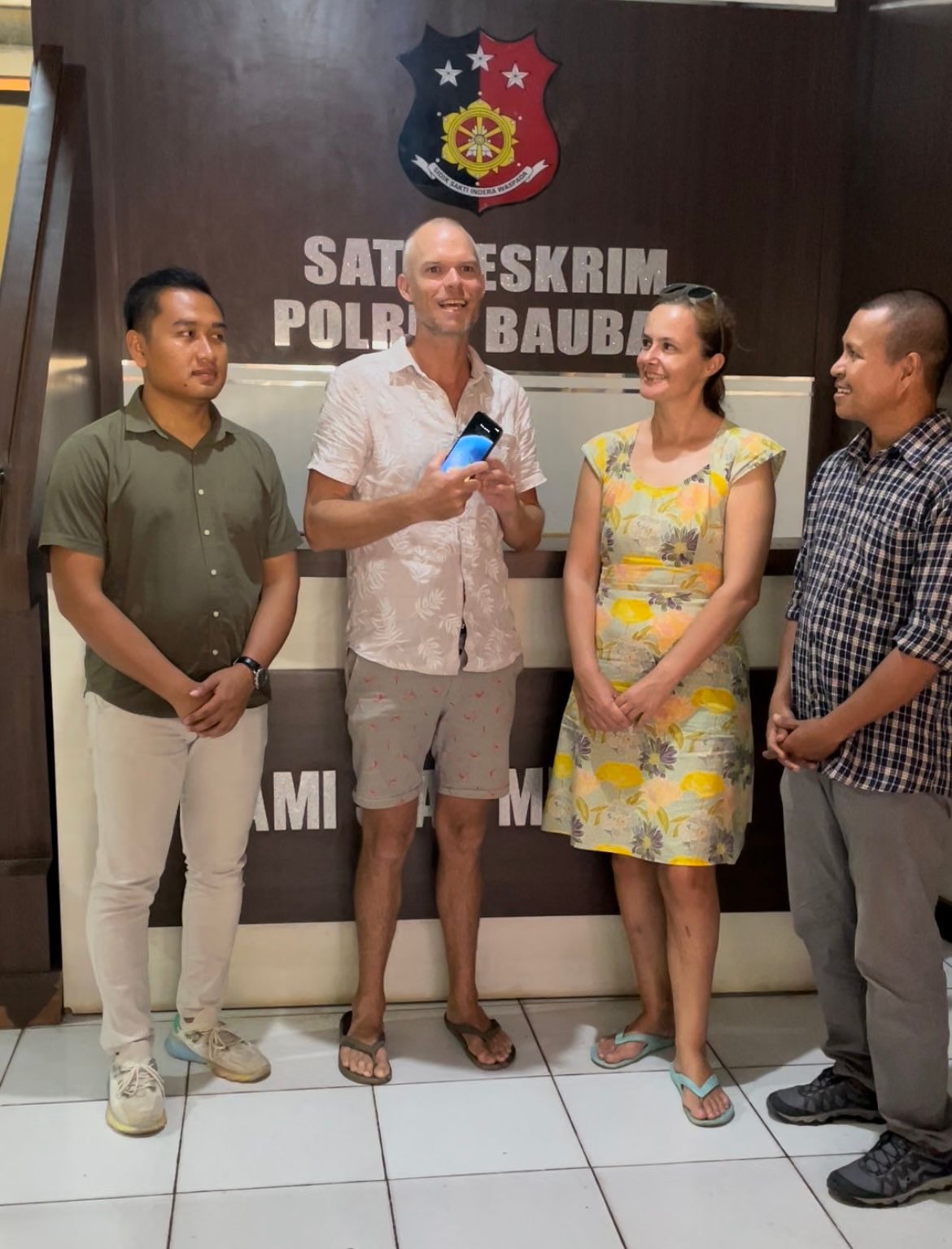 We’re led into a small, pink room with a large desk and a coffee table decorated with plastic pink flowers and a couple of sofas around it. We sit on the sofa and are joined by a newly minted and very young chief detective (as he tells us later, 2 weeks in Bau-bau). A couple of other guys are there and Salam. The chief speaks relatively good English but after a while switches back to Bahasa with Salam translating. The phone is presented to Graham who unlocks it to everyone’s relief. It’s undamaged except for the missing cover. The chief offers Graham his cover after he mentions this and we all laugh.