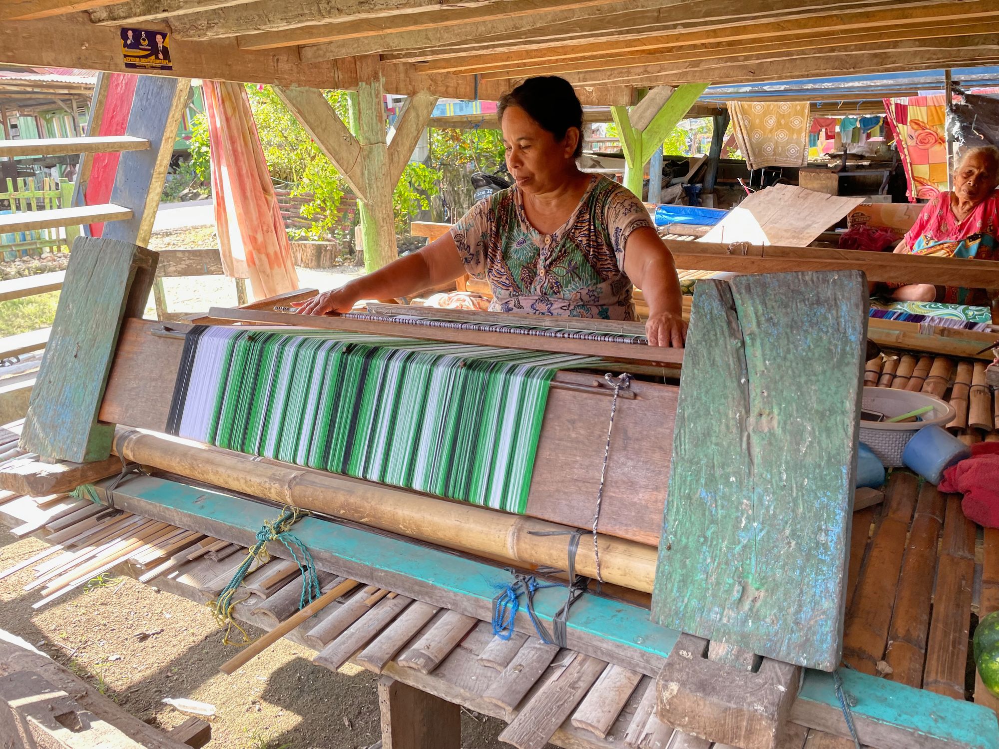 Weaving village is next where we’re told it takes almost 2 weeks to weave one sarong. The weaving contraption is a frame placed over the legs, and involves a whole lot of extra sticks inserted between the strings magically attached to the frame. The process is slow and painful but the woman we watch appears into it. Graham leaves with a men’s sarong which will make a nice table cloth or throw if he decided not to wear it.