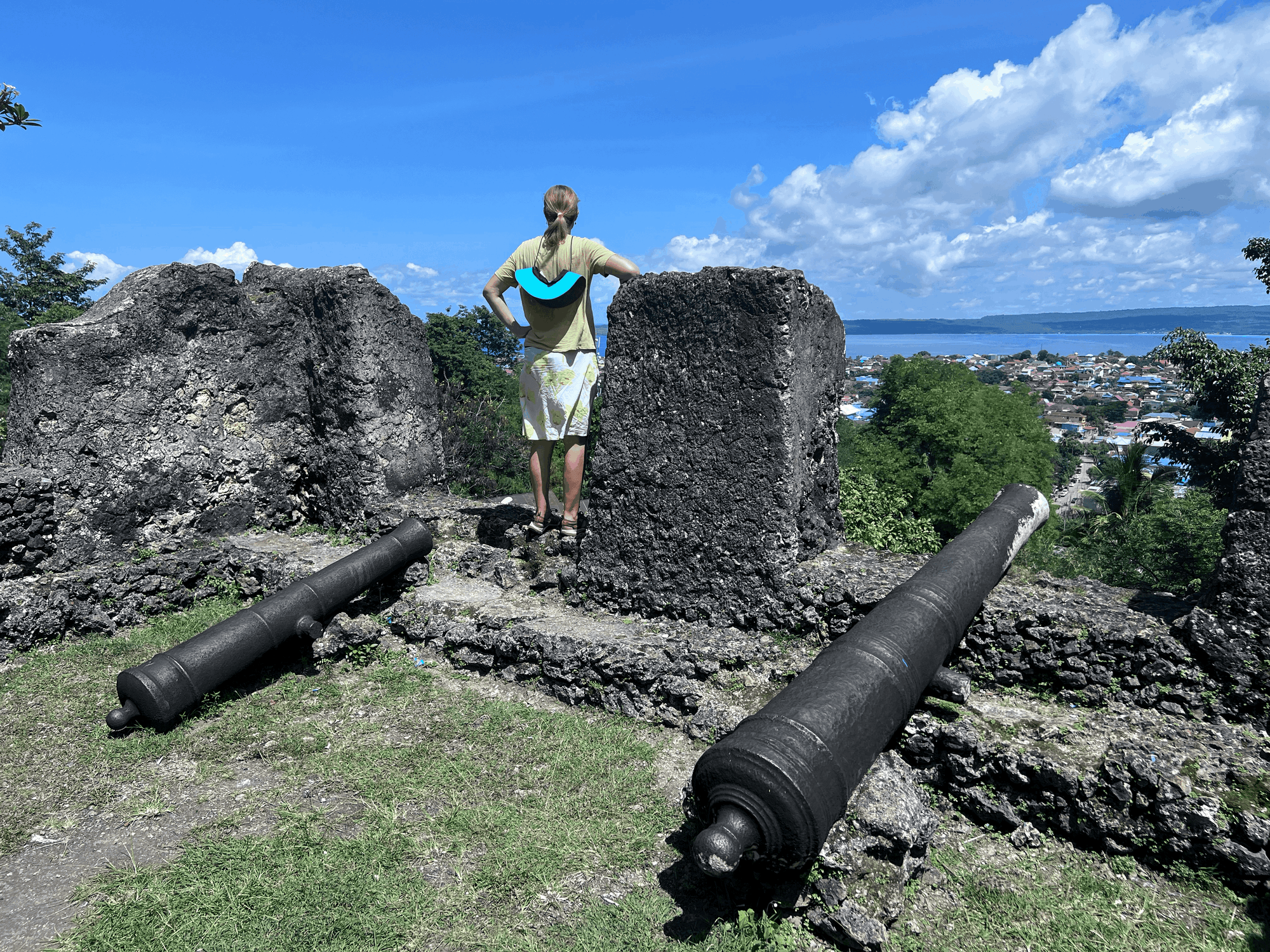 Wikipedia tells us this is officially the largest fort in the world by square meter and was built by a Sultan in late 1500s. Determined to verify this, we set off in the morning around 9am which is really too late as the heat is barely tolerable. Jake opts out of today’s excursion, so it’s just three of us taking the steep path through the backstreets, then along a ridge which offers 180 views of the entire harbour. We have to walk along a major road for a while and the scooters beep and wave as they pass us. It’s funny watching the faces as they spot us and react; I swear it’s a reflex for some - we see enthusiastic wavers, smilers, nodders and hear a whole lot of Hallo Mr.