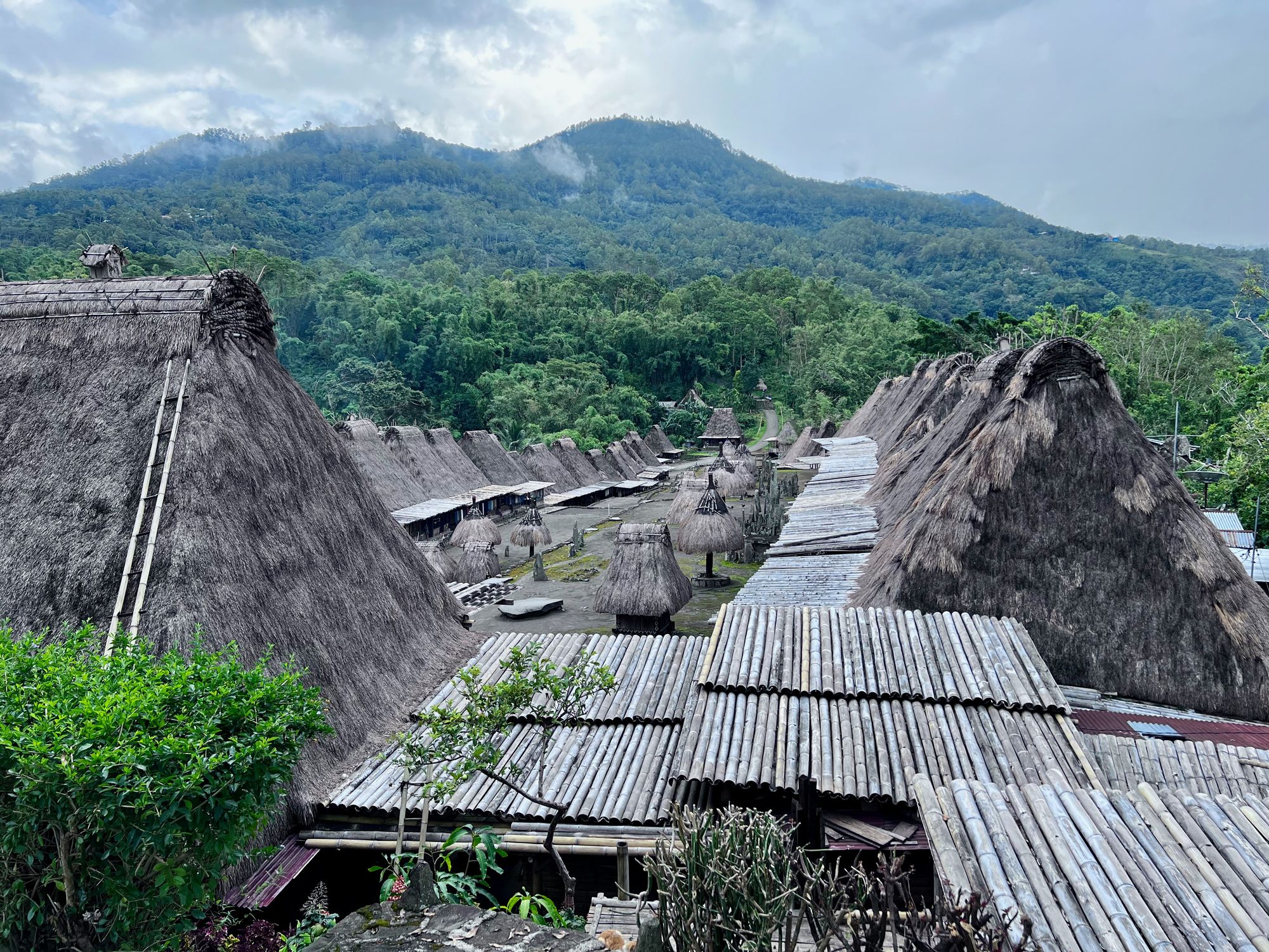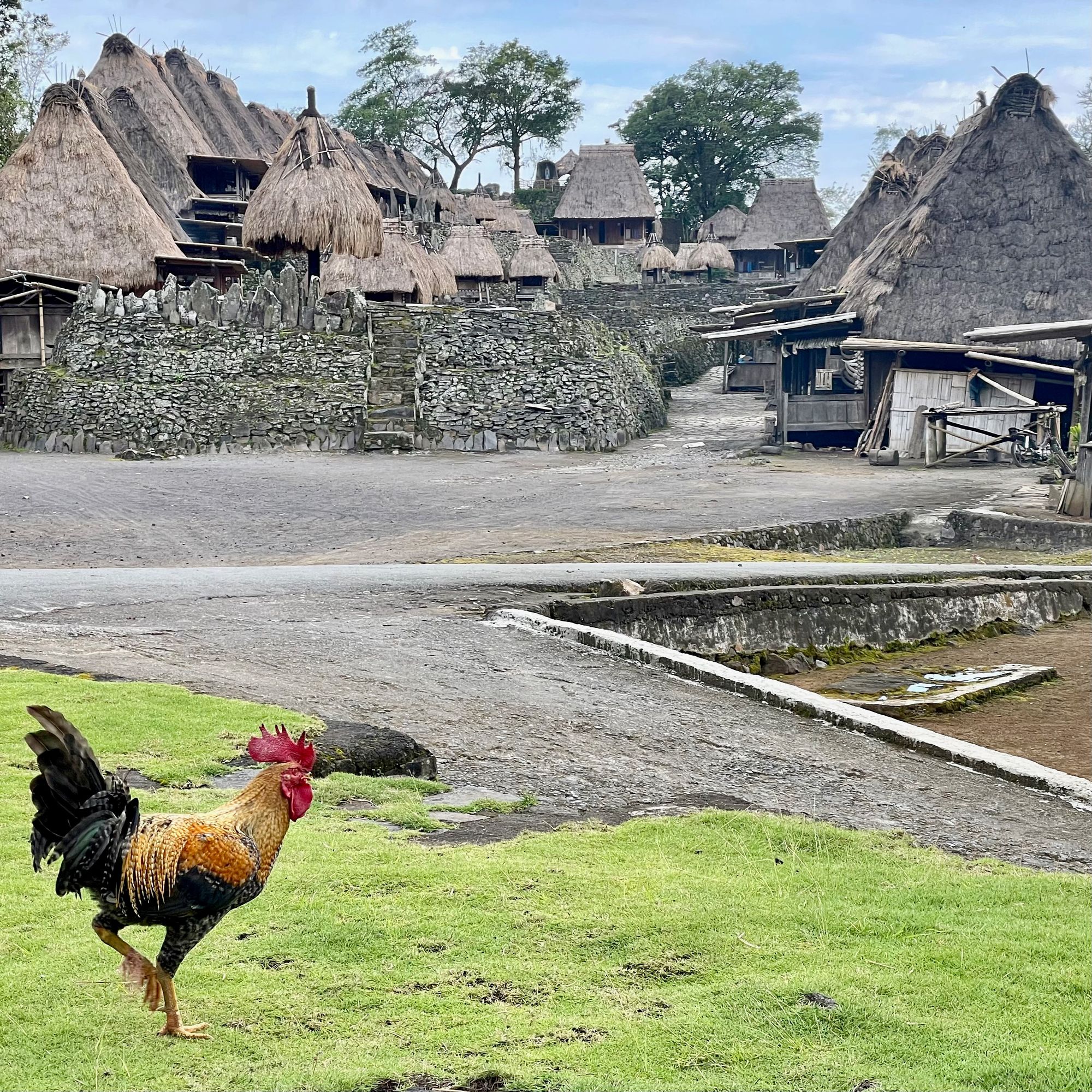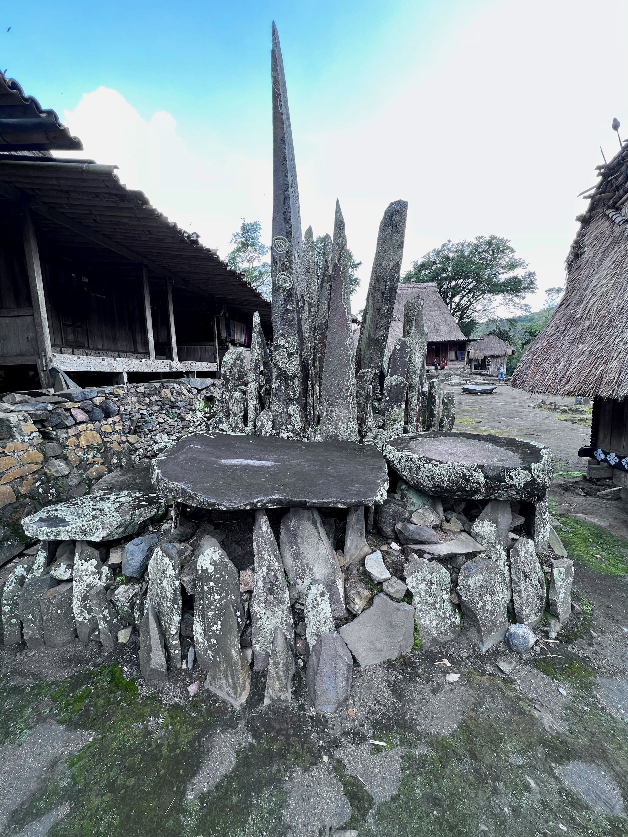It is postcard pretty, with two rows of identical wooden cottages with high thatched roofs, all facing a large square filled with what look like ceremonial structures and megalithic tombs.