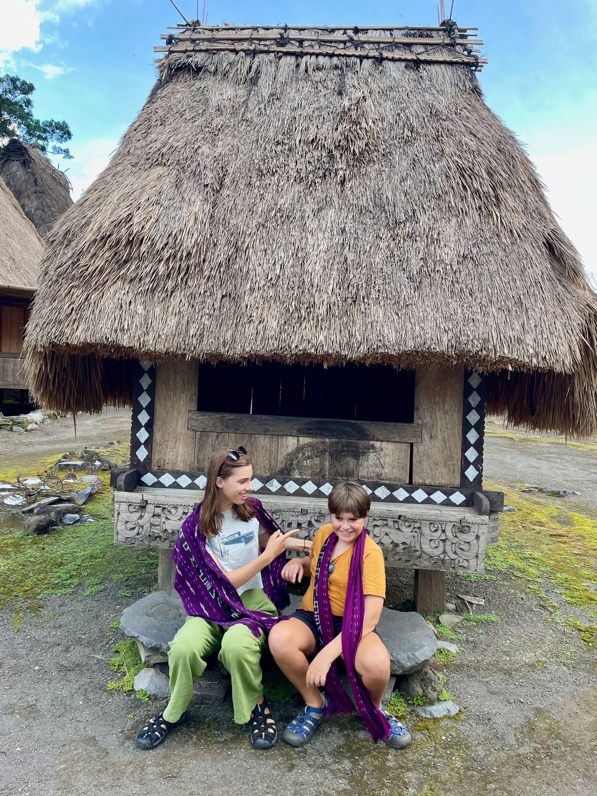 There is a group of small kids playing in the main square but the only other evidence of village life is a few women sitting and weaving on their front porches, with colourful weaved scarfs displayed for sale all along the front. There is a small fee for visiting here and it’s completely understandable that they’re taking advantage of the economic opportunity however it feels very quiet for a village. Either very few people live here or they're out working.