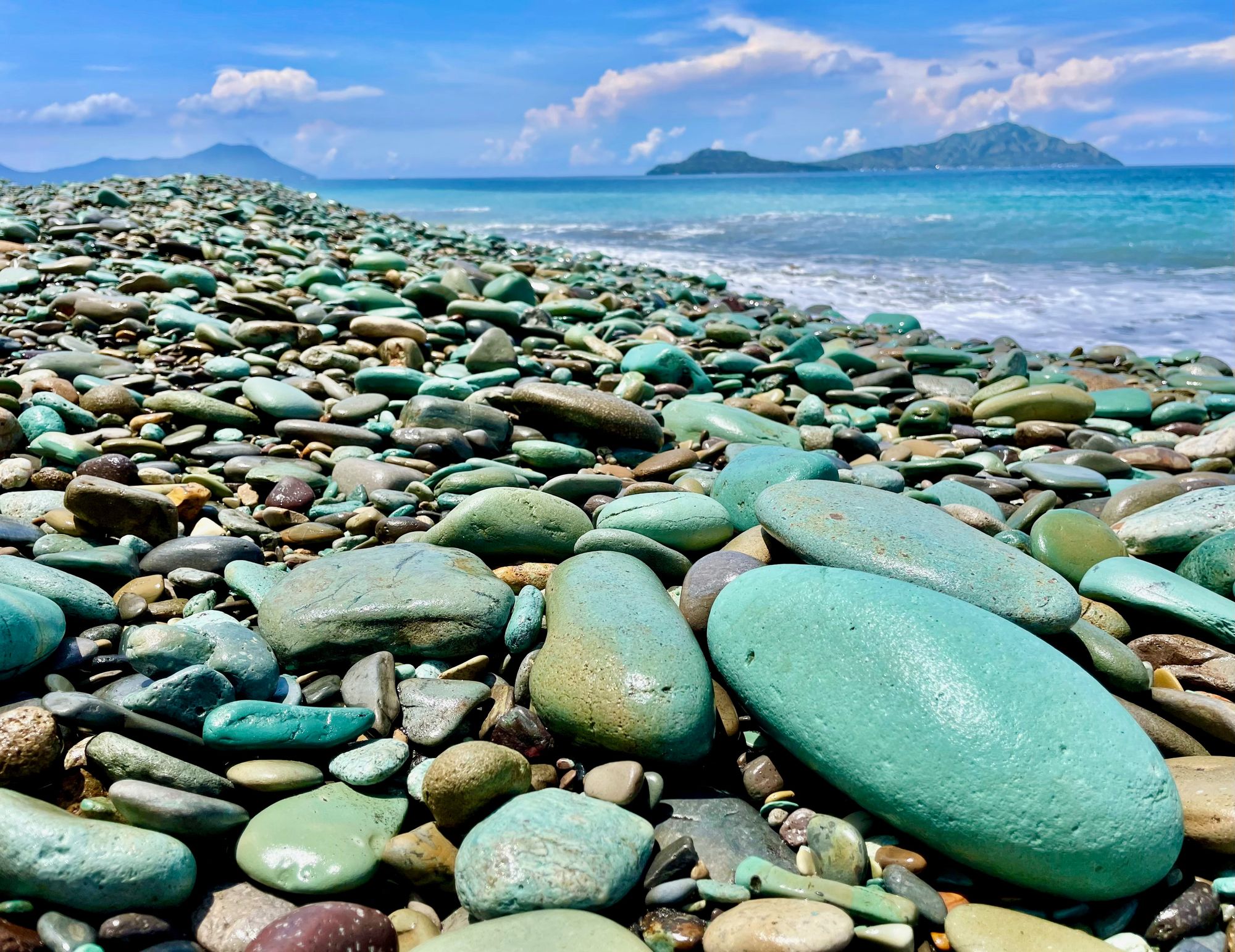 The beach itself is covered in stones ranging from blue to green in colour and very large to a pebble. Very scenic and not too much rubbish to spoil the view but definitely no swimming as the waves smash onto the beach with some force.