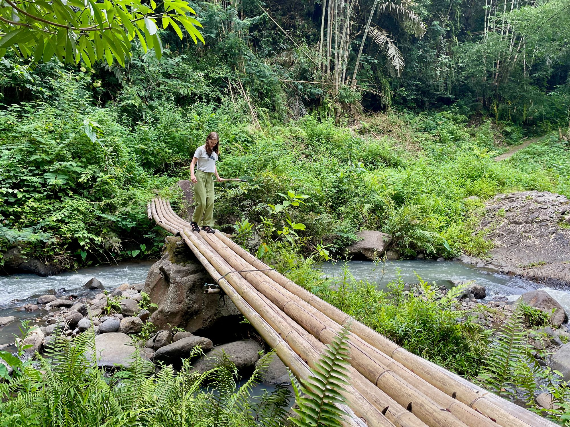 Moni itself is a cute little mountain town with homestays, restaurants and quite a few visiting backpackers. We walk to a waterfall just out of town and after crossing a rickety bamboo bridge to reach it, we’re disappointed we can’t swim in it although it does quite nicely for a selfie.