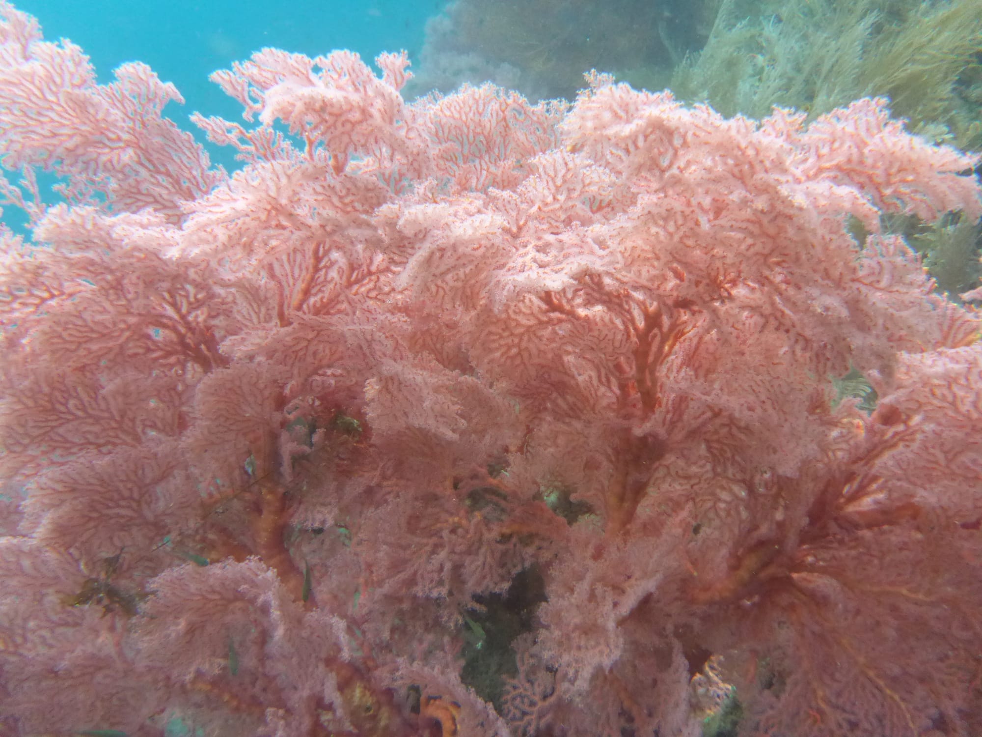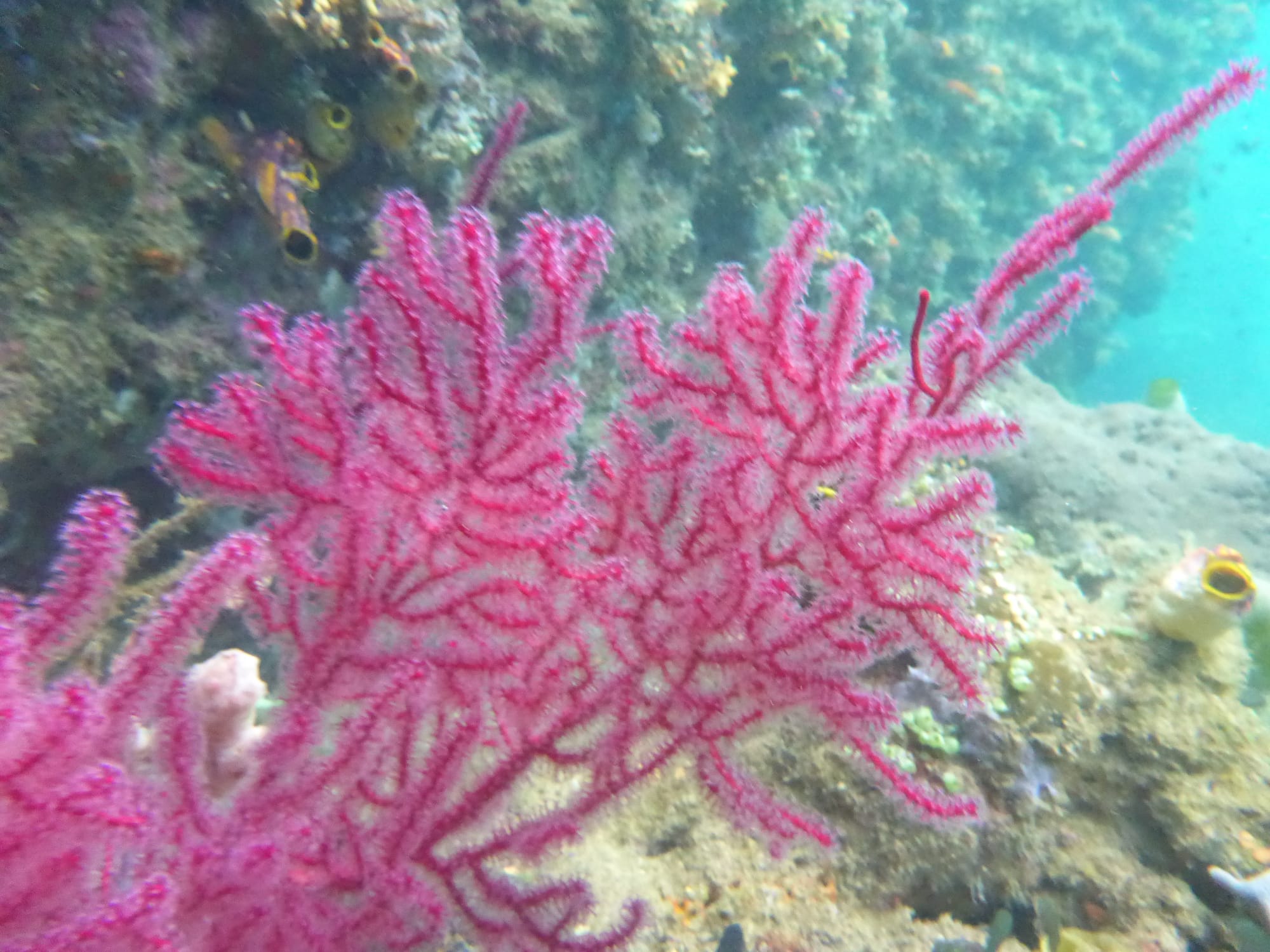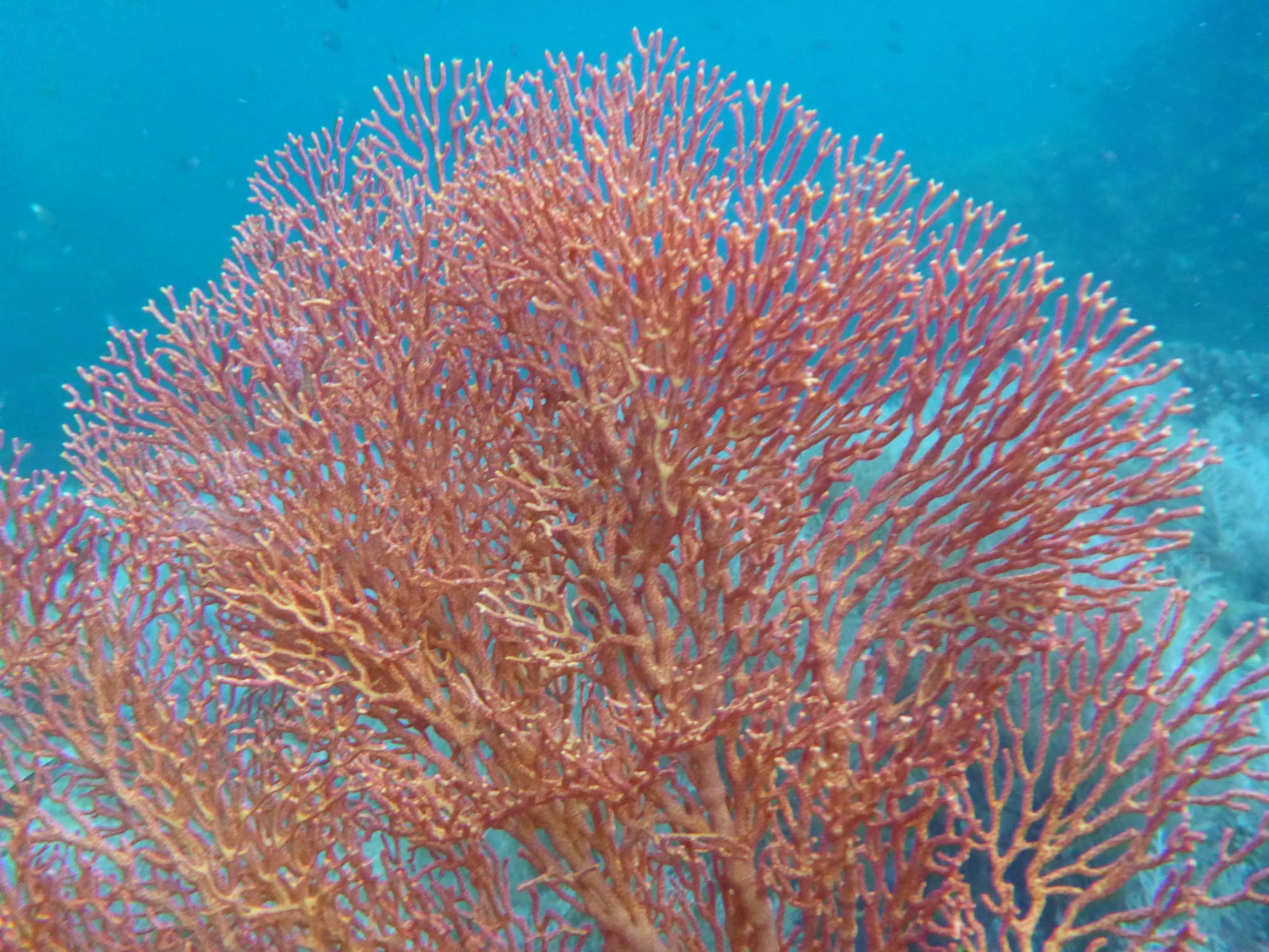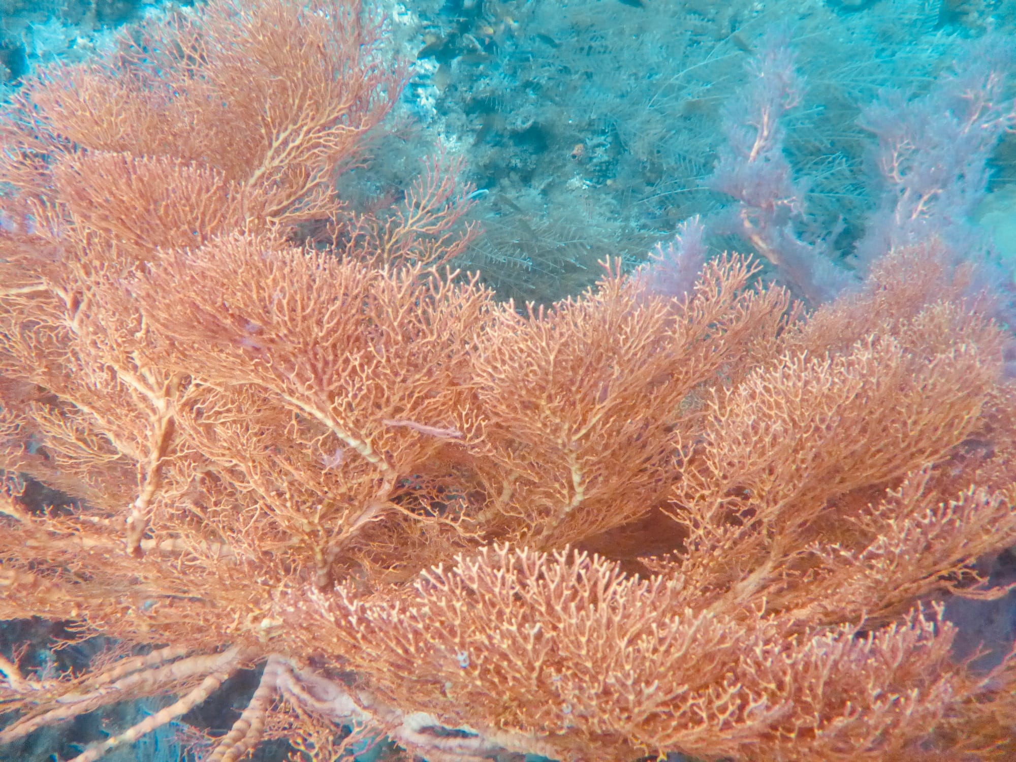 Just outside one of the caves, we come across a colony of the biggest and most colourful giant coral fans I have ever seen. A sea of bright orange, pink, yellow and purple, they sway in the current like peaceful giants.
