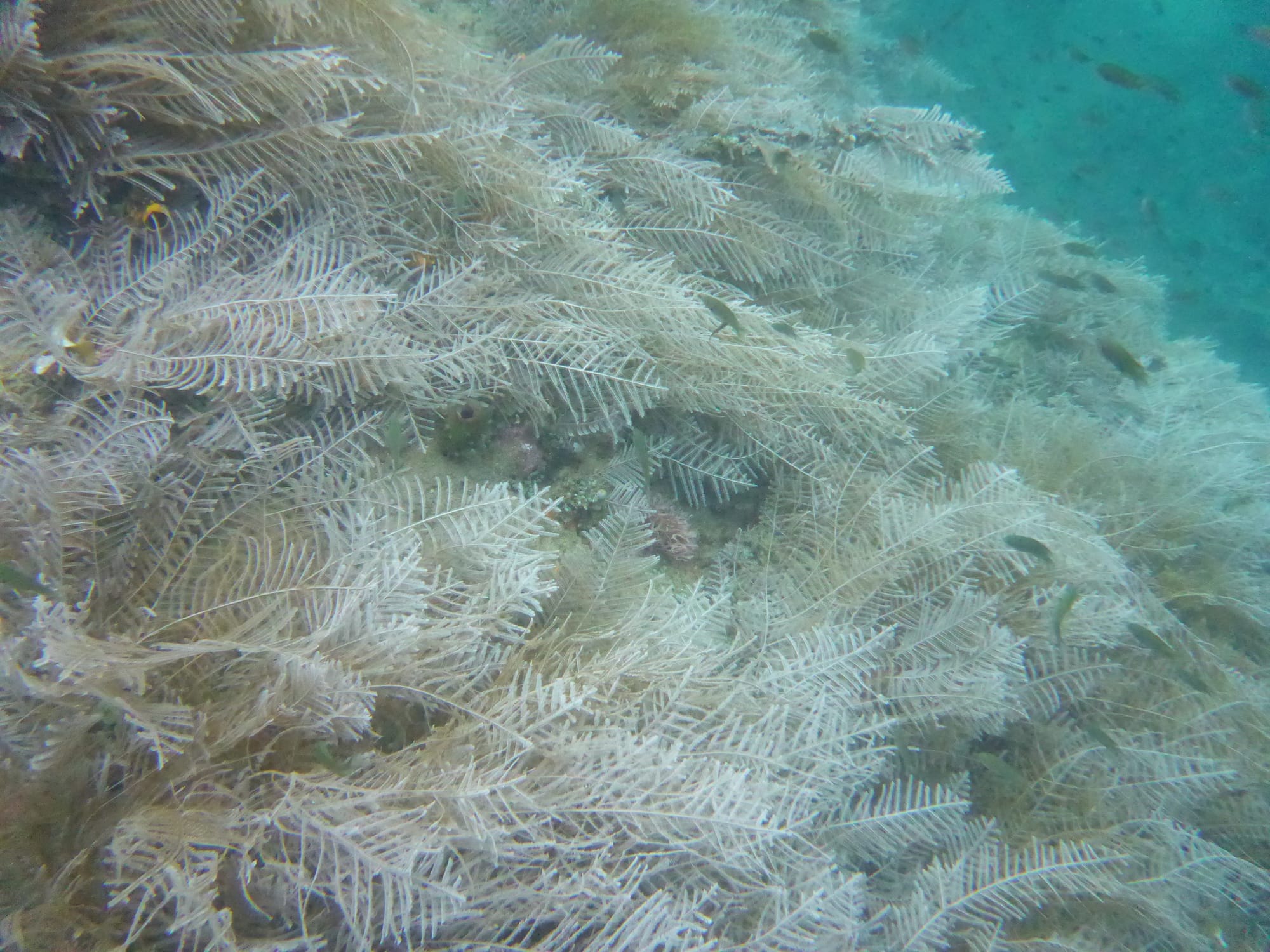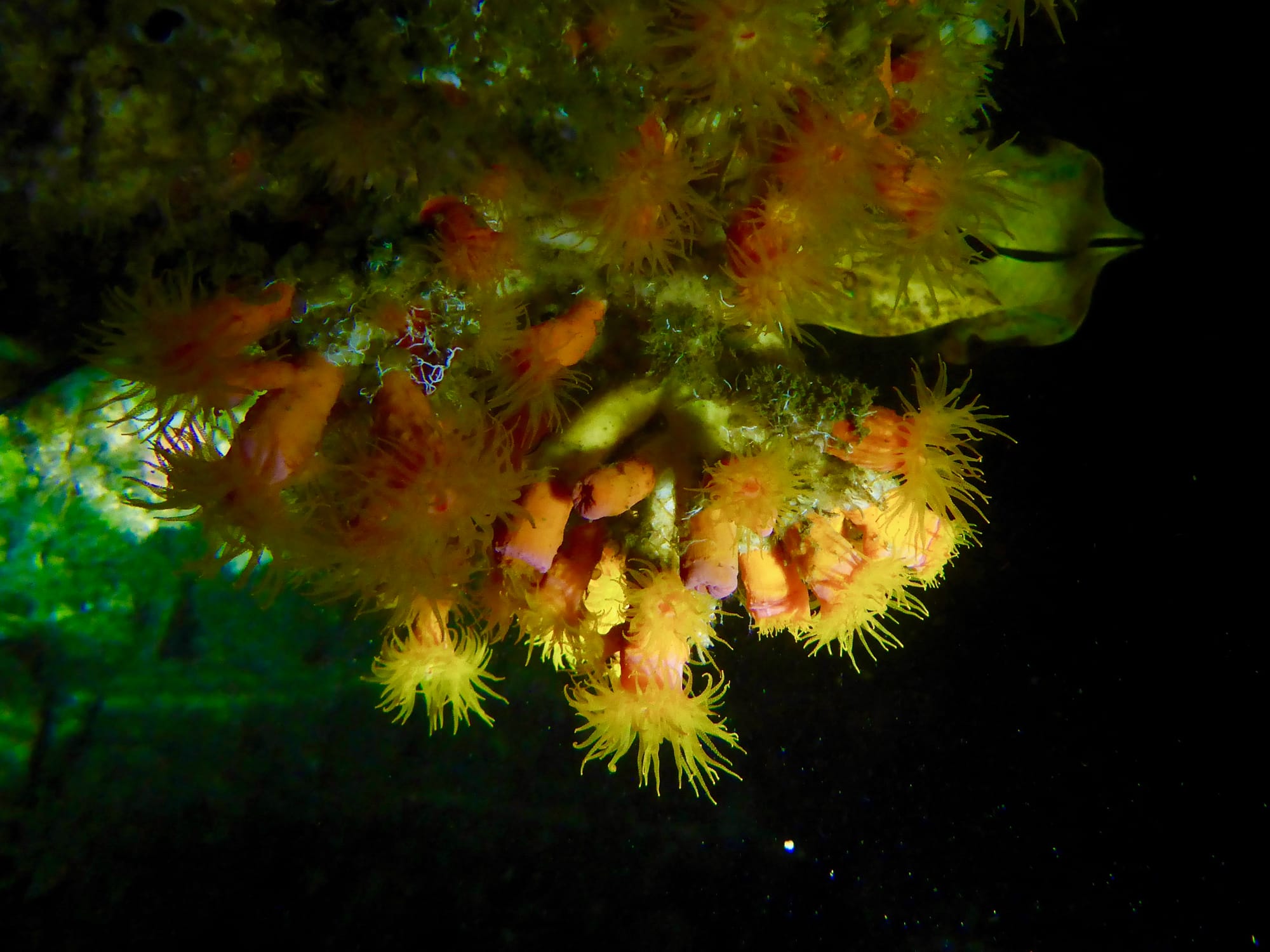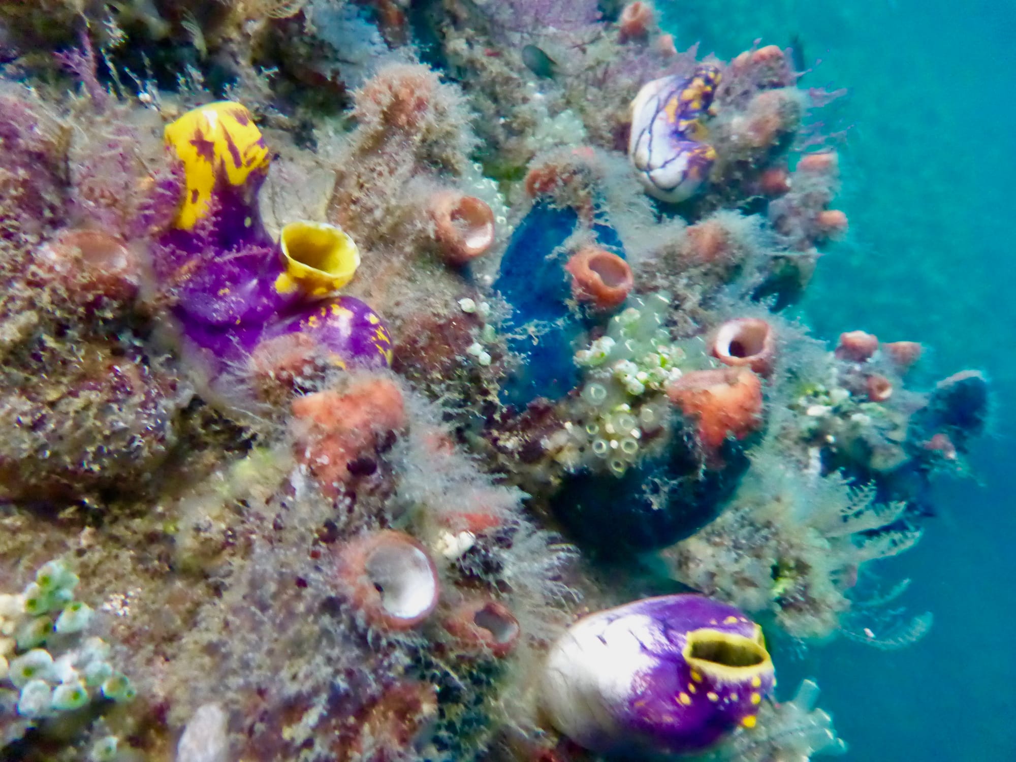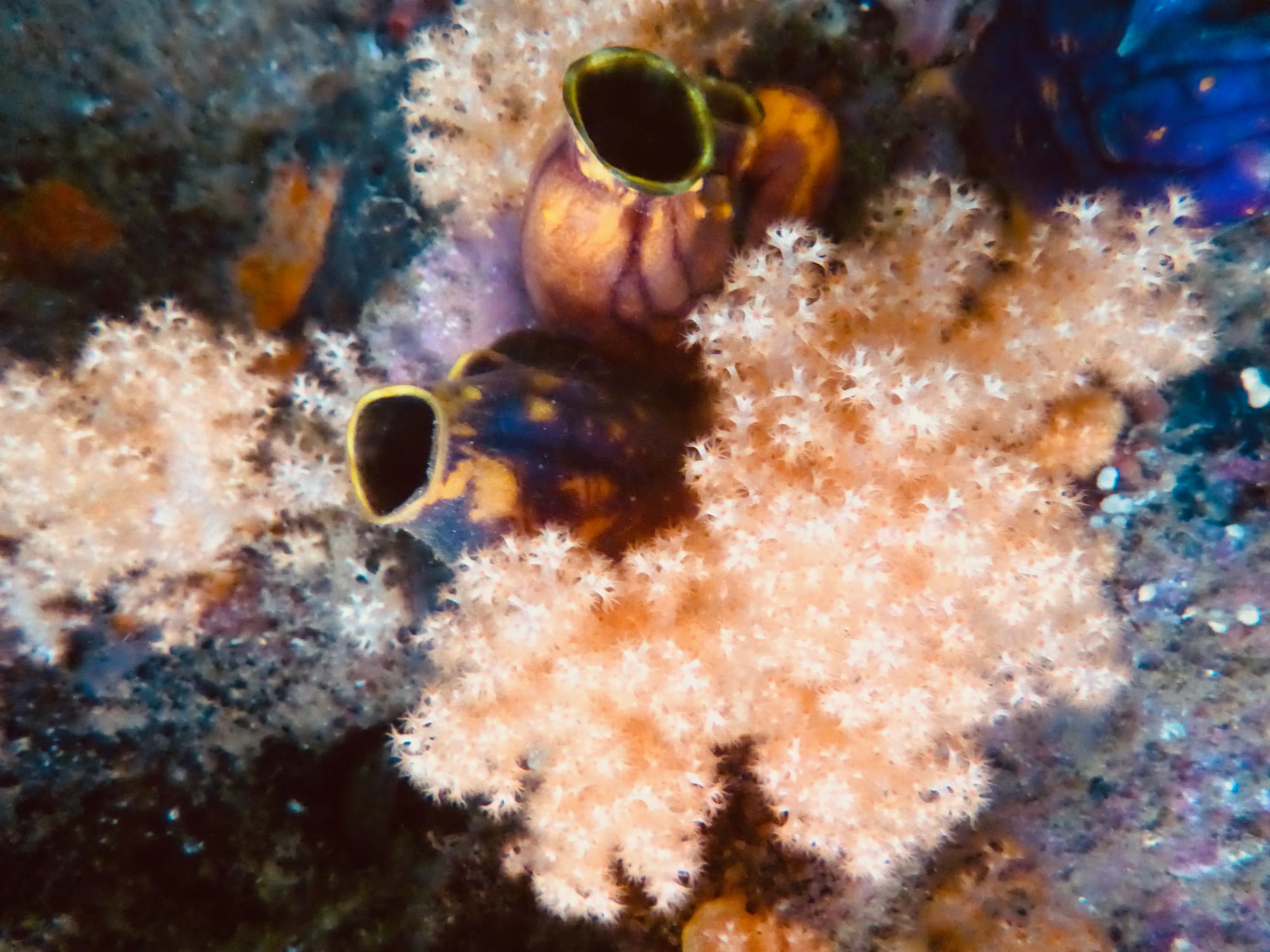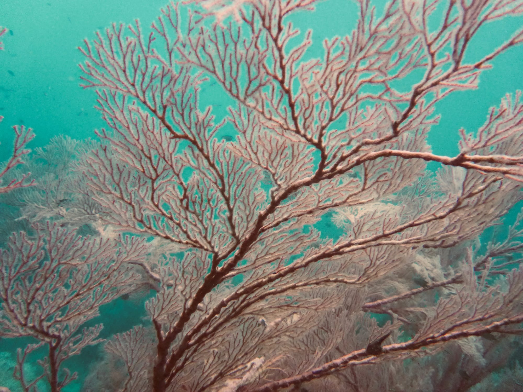 Just outside one of the caves, we come across a colony of the biggest and most colourful giant coral fans I have ever seen. A sea of bright orange, pink, yellow and purple, they sway in the current like peaceful giants.
