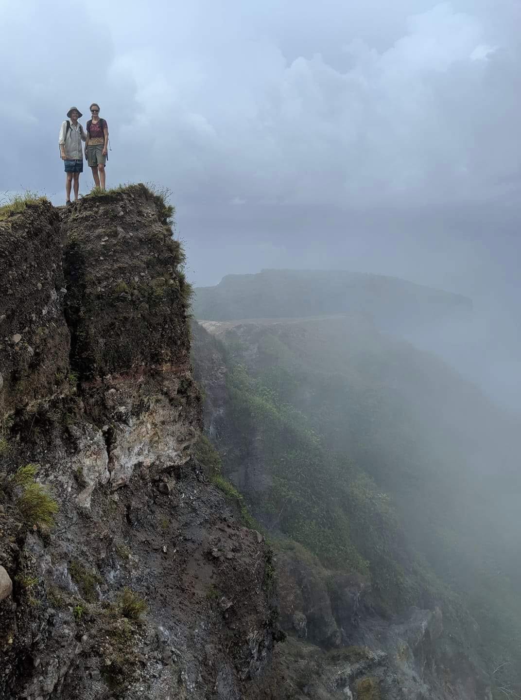 On top of the volcano (left), soaked but happy after summiting the volcano (right)